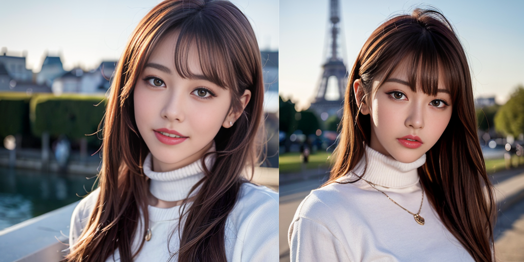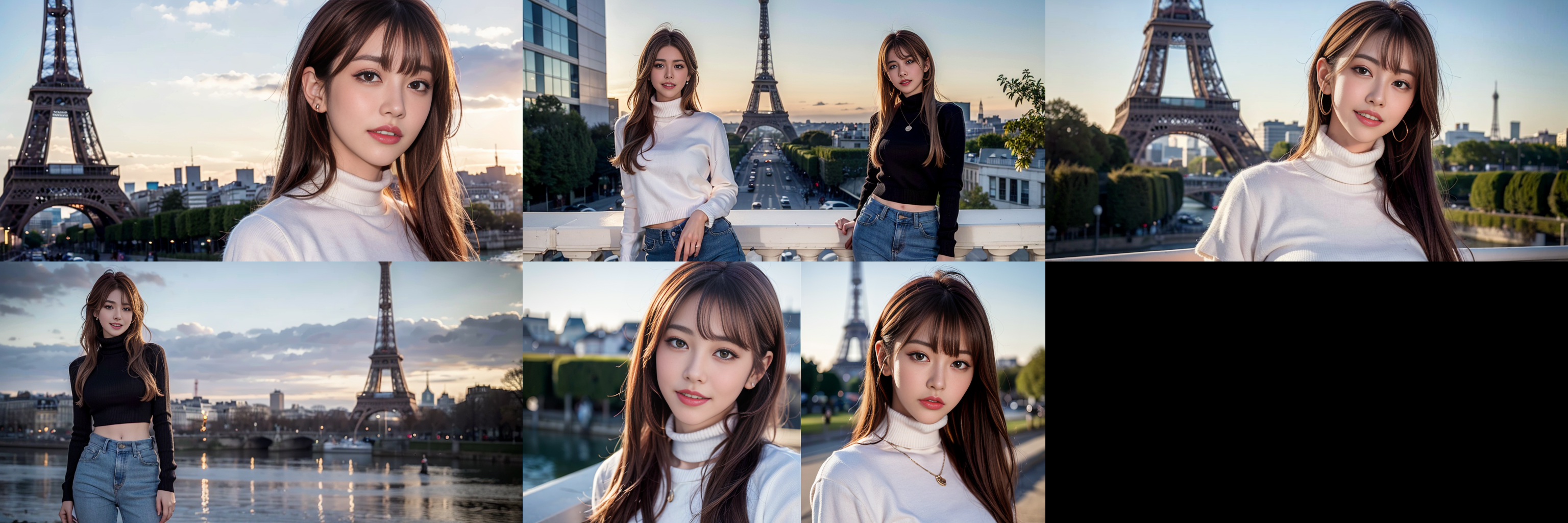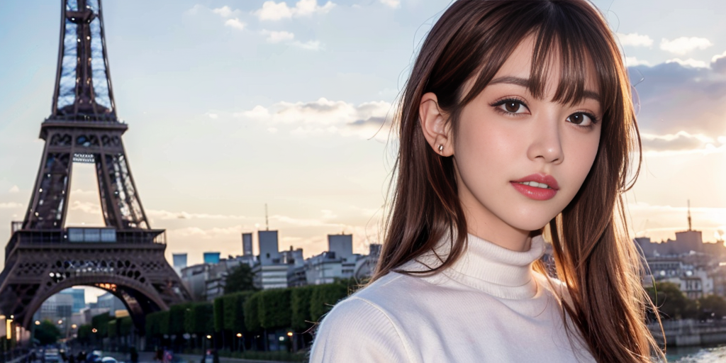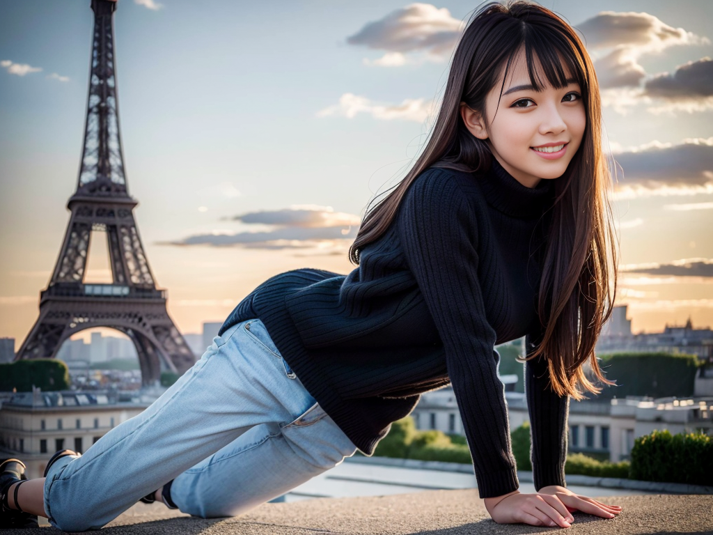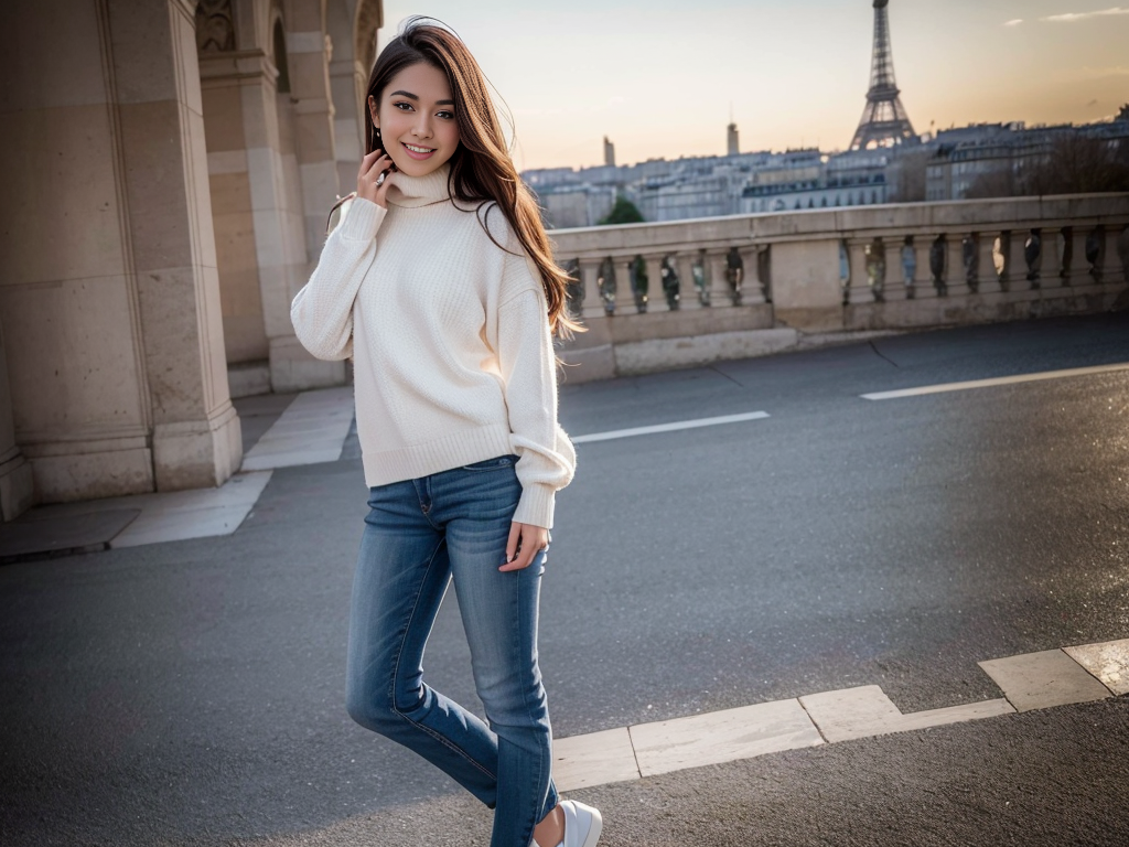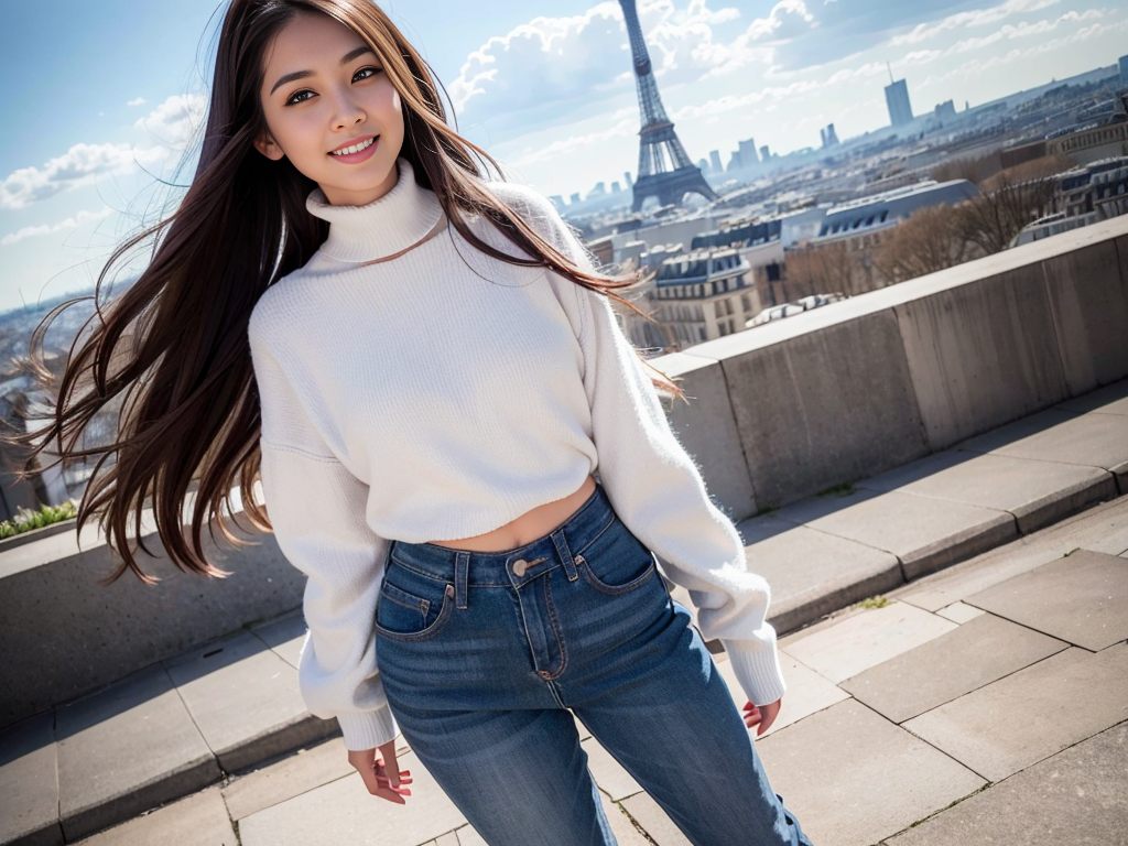 (8k, best quality, masterpiece:1.2), (realistic, photo-realistic:1.37), ultra-detailed, 1 girl, full body, Standing on the Paris city wearing turtleneck sweater and skinny jeans, with Eiffel Tower in the background, cute,solo, beautiful detailed sky, (smile:1.15),(closed mouth), small breasts, beautiful detailed eyes, (long hair:1.2), floating hair NovaFrogStyle,